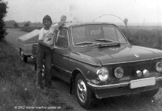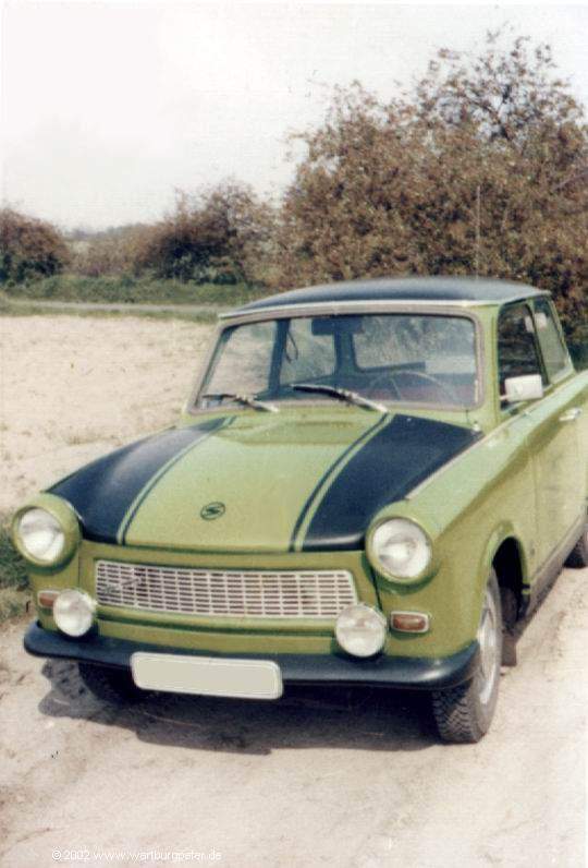 Zwischen 1977 und 1978 fuhr mein Onkel diesen Trabant P601, Bj. 1975 mit 23 PS. Es gibt nur dieses eine Foto und nicht viel zu diesem Auto zu sagen. Natürlich war dieser Trabi moderner, d.h. zeitgemäßer, hatte mehr PS und war auch schneller, als der Alte. Die Farbgebung stammte noch vom Vorgänger. |