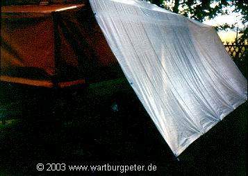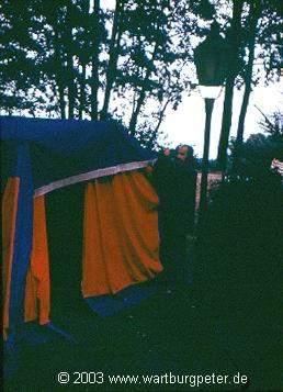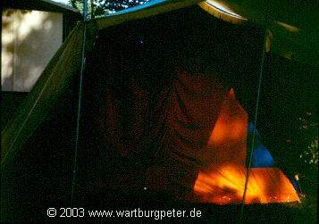 Die Bilder hier unten sind sehr duster, so das man nicht viel mehr als ein Zelt erkennt. Das besondere daran ist jedoch, das sich um einen "normalen" Selbstbau-Einachsanhänger handelt. Ein Kastenwagen. Meine Tante und Onkel fuhren lange Zeit damit in Zelt-Urlaub. Alles was dafür benötigt wird, hat mein Onkel selbst angefertigt. Egal ob Zelt, Vorzelt, Schlafstelle, was auch immer! Und alles in einer Qualität, die alles im Umkreis in den Schatten gestellt hat!