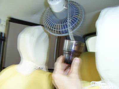 Der Schlauch für Trinkwasser tropft nicht während der Fahrt, denn der Thermosbehälter steht etwas niedriger im Kofferraum. Die Aluminiumfolie am