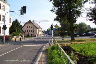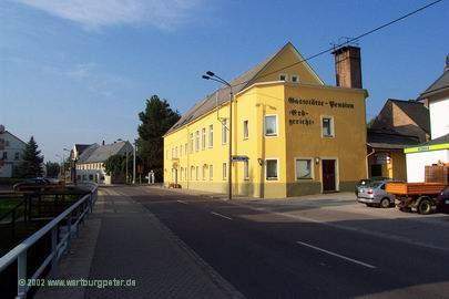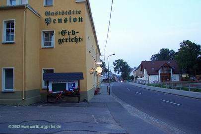 Ein paar 100 m in den Ort hinein gefahren, sieht man schon von weitem die Gaststätte/ Pension "Erbgericht". Zur Orientierung: die einzige Ampelanlage im Ort muß man passieren, dann sind es nur noch wenige Meter. |