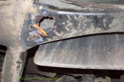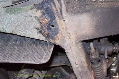Eine ähnlich schwierige Stelle ist die Ecke in der Nähe des Tankstutzens (der bei mir inzwischen erneuert und verzinkt ist). Hier muß ich ebenfalls regelmäßig aufpassen. |