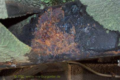 Obwohl an meinem Auto (zuweilen glücklicherweise) tonnenweise Elaskon haften, gab es dann doch trockene Stellen/ Hohlräume, hinter denen Rost in "verschiedenen Varianten" zu finden war. |