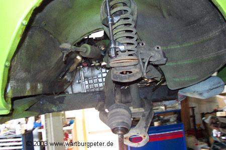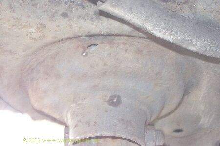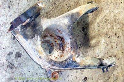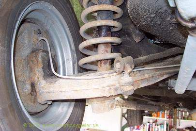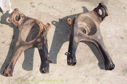 Eine andere Stelle, die es zu reparieren galt, war dieses kleine Loch im Federtopf des hinteren Querlenkers. Eine gute Gelegenheit, gleich die Buchsen zu wechseln. Dabei kamen Olaf und ich nicht nur ins schwatzen und schwärmen, sondern fanden eine Möglichkeit, die Buchsen der Radaufhängungen der 311'er zu regenerieren. |