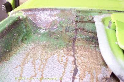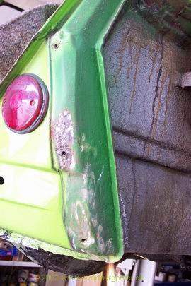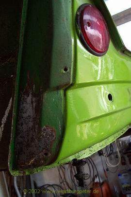 | Meine alljährliche Kontrolle gilt den hinteren Ecken des Tourist. Leider ist das Blech dort sehr rostvernarbt. Dieser Rostbrand kann wohl nur durch herausschneiden beseitigt werden. Alles andere ist hinauszögern. O.k., ich zögere hinaus. Man sieht es nicht, es ist wasserdicht und ich kontrolliere und pinsele diese Stellen mehrmals im Jahr. Da es eher kosmetische Reparaturen sind, das Auto jeden Tag im Einsatz ist und ich "all mein Geld bei Olaf ließ" ;-), habe ich auch in kommenden Jahren noch Ziele zu erreichen . . . |