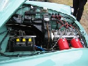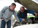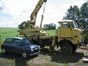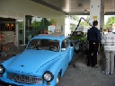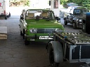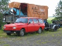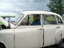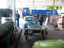 So konnte man Einblick in die Kunst des Restaurierens nehmen, denn gegenwärtig befand sich 311'er Coupé in der Schweißlehre, die der Meister sich selbst mühevoll geschaffen hat. Diese Lehre erlaubt, wie bei der Wiederherstellung archäologischer Funde, selbst Fragmente eines Wartburg korrekt zu positionieren und zusammen mit verfügbaren Neuteilen oder selbst angefertigten Reparaturblechen zusammenzufügen, so das bald daraus wieder ein verkehrstüchtiger Wartburg entstehen kann. Das besondere dabei ist, daß auf diese Weise verhindert wird, daß sich Karosserie und Rahmen verziehen.
