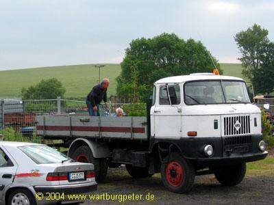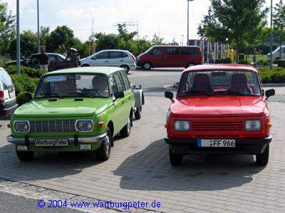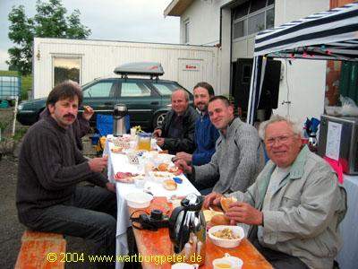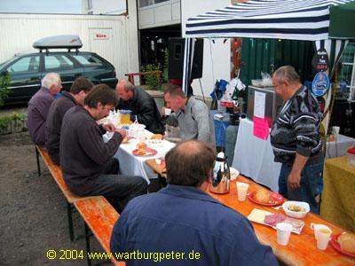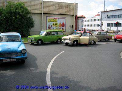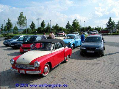 Begegnung mit anderen Wartburgfreunden an der Autobahnraststelle, die schon auf uns warteten. Der Konvoi wird größer... Alle Wartburg sind vollgetankt, jetzt sind die Fahrer und Beifahrer dran - hier bereits in Dornburg. |