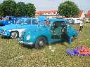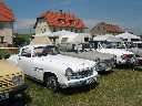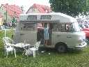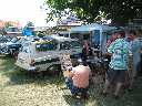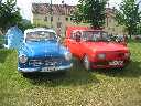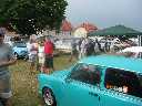 Nach dem herrlichen Treffen bei Olaf, dem Restaurator, fuhren wir gemeinsam nach Dornburg. Die Fahrt verlief nicht ganz pannenfrei und dauerte etwas länger, als geplant. Nachdem ein loses Hinterrad an seinem "Camping-Stammplatz" wieder befestigt werden mußte, eine Zündkerze mit Stecker der Erneuerung bedurfte, sollte im weiteren Verlauf noch die gesamte Zündung neu eingestellt werden. Es war die Jungfernfahrt nach Dornburg für Andreas' Camping. Weit nach Mittag kamen wir alle heil nach Dornburg, wo uns ein schöner sonniger Tag mit vielen Wartburgs erwartete. Es dürften diesmal so um die 170 - 180 Fahrzeuge gewesen sein.