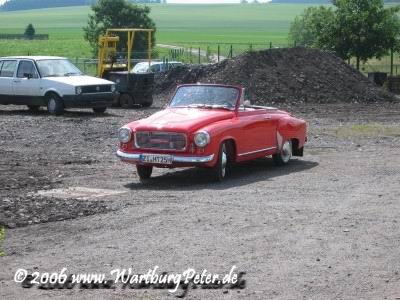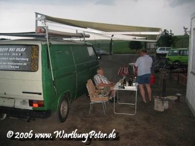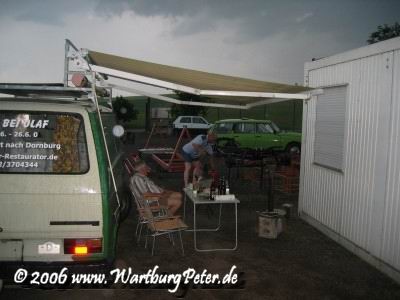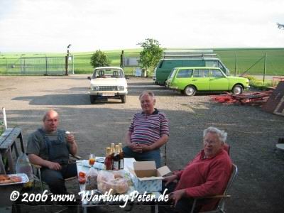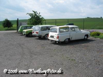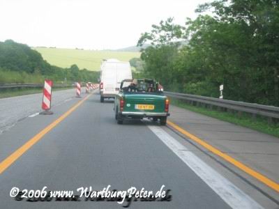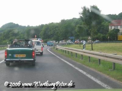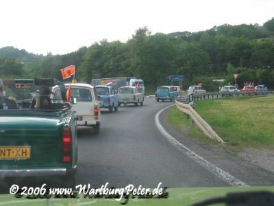 Nach einigen Stunden Fahrt (der übliche Ferien- und Baustellenstau) treffe ich in Eisenach auf eine lange Reihe Trabis aus Holland und Polen. |