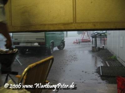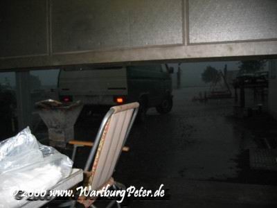 Jetzt stürmt es so heftig, daß wir schnell die Autos schließen müssen, die Würstchen sind schon gar. |