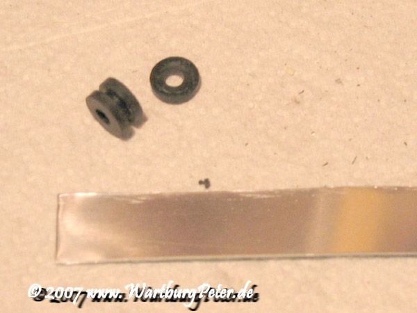 Beim Aufräumen meines Kellerarbeitsplatzes fand ich einen Aluminiumstreifen und den Rest eines durchgeschnittenen Leitungsdurchführungsgummis, ca. 8mm (Wer hebt solche Sachen schon auf?!).