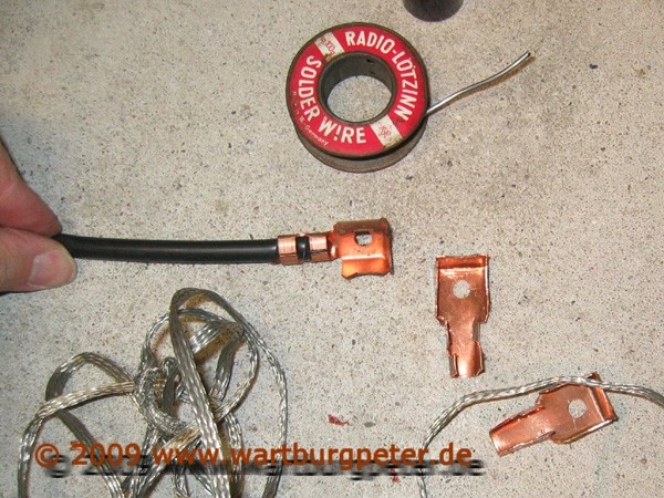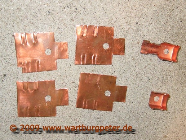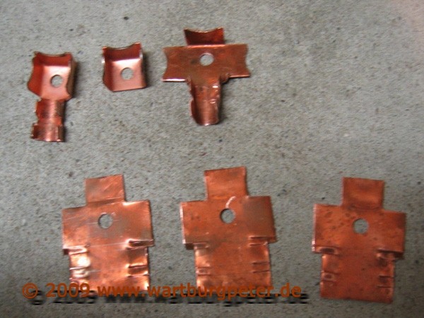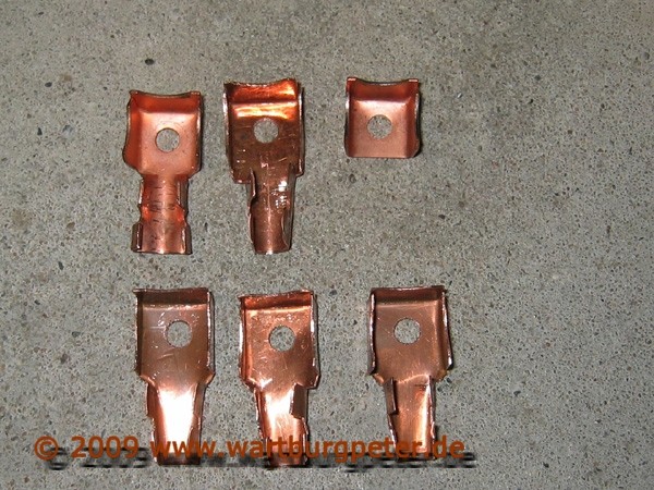 Nach ca. 2 Stunden sind 4 Kabelschuhe fertig. Links oben das Original, rechts oben das, was es zu ersetzen gilt, mitte und unten meine angefertigten Kabelschuhe.