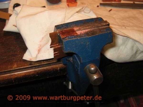 Damit sich die Zange später schön an die Batteriepole schmiegt, werden die Flanken mit der Halbrundfeile bearbeitet.