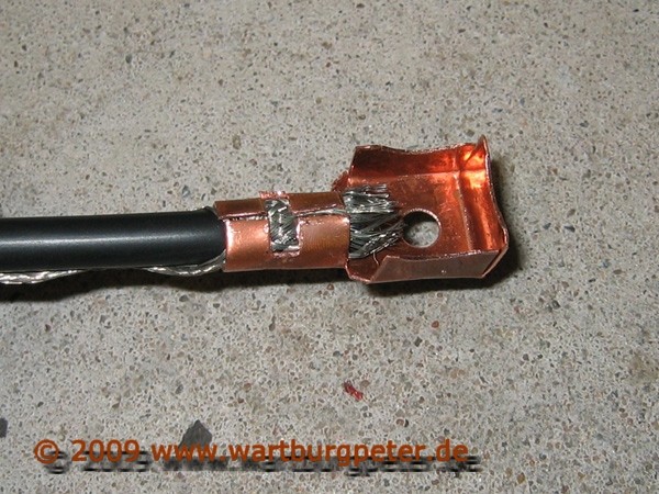 Um die beiden gegenüberliegenden Kabelschuhe einer Zange miteinander zu verbinden, verwende ich Kupfergeflecht, welches ich zusammen mit dem Kabel verkrimpe und verlöte.