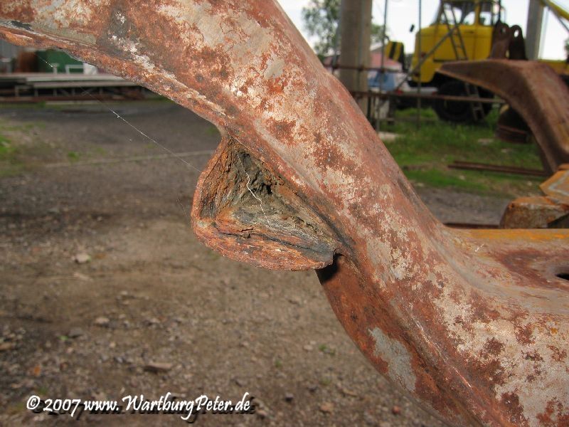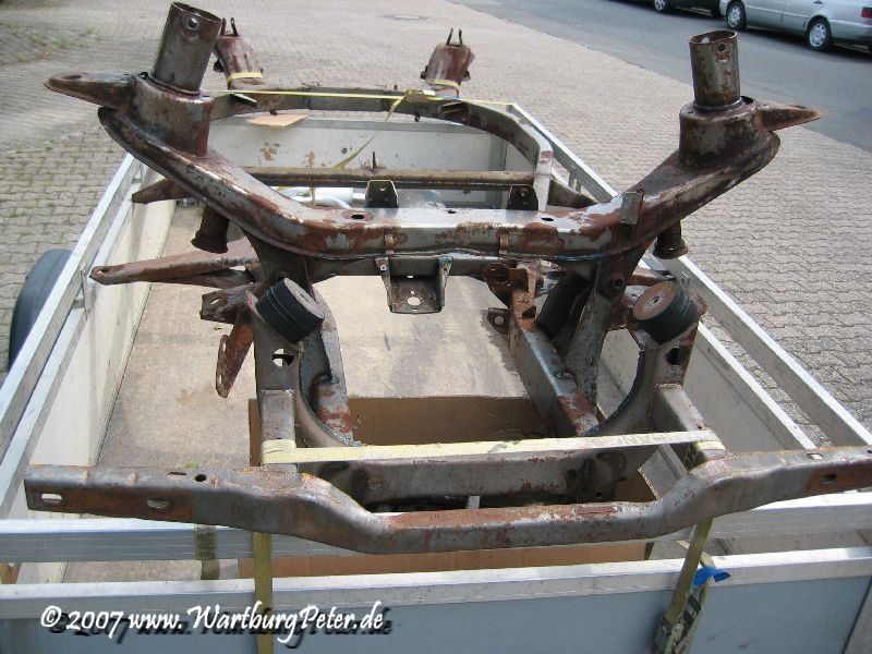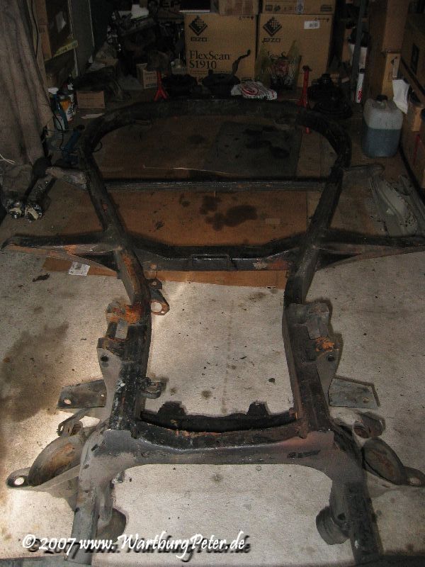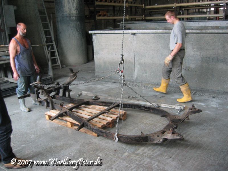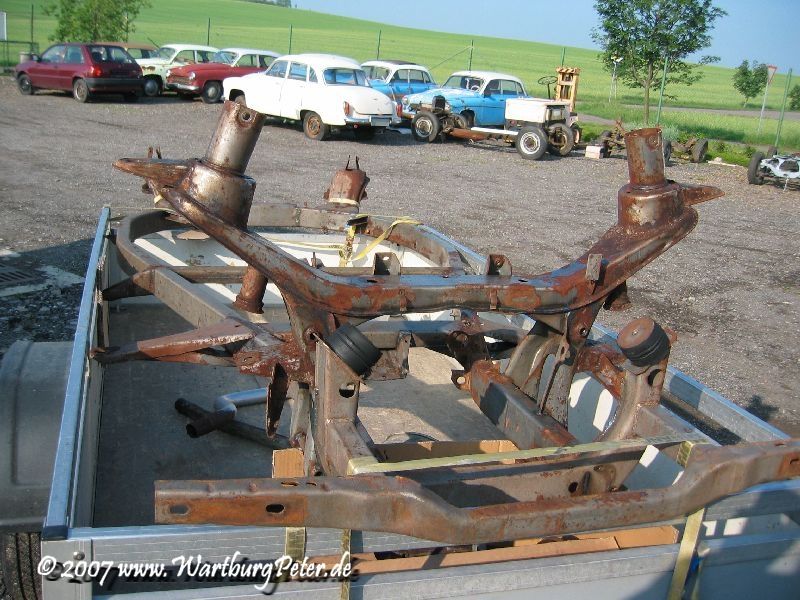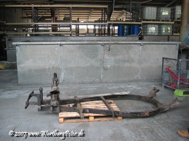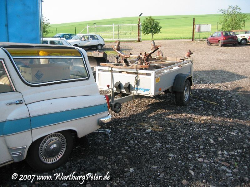 Die professionelle Instandsetzung des Rahmens war ohnehin geplant. Probleme an den Karosserieauslegern führten mich bereits 2002 zu Olaf. Also wieder das Wartburg-Gespann gesattelt und den Rahmen in die Werkstatt geschafft. Die Distanz von ca. 550 km habe ich mit dem Anhänger am Camping in 9 und 13 Stunden je Richtung bewältigt.