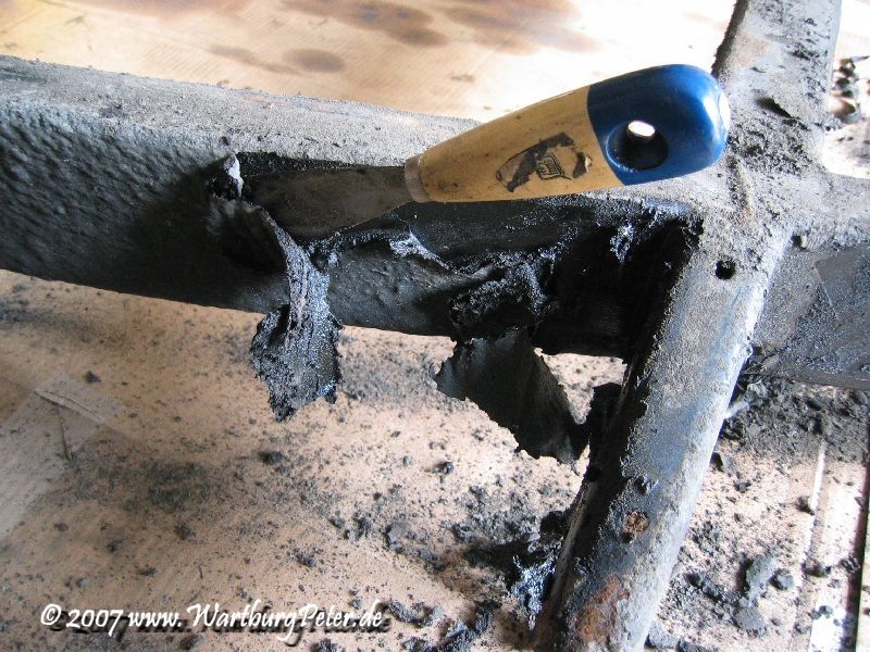 Keine Frage, ich war entsetzt, aber irgendwie doch erleichtert, den Rahmen nicht gesandstrahlt zu haben. Zum einen, weil ich dadurch über den Zustand eine bessere Aussage erhalte, zum anderen, weil der Rahmen nicht an den Oberflächen "angegriffen" wird, die intakt sind. Es entsteht keine zusätzliche Rauhigkeit. Schließlich wird der Rahmen auch innerlich entkeimt (entsprechende Löcher habe ich zuvor gesetzt).