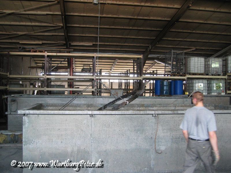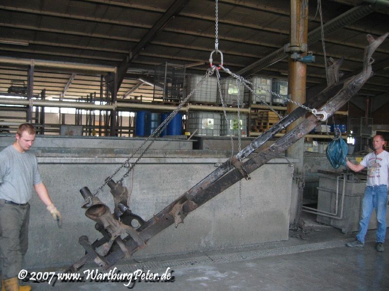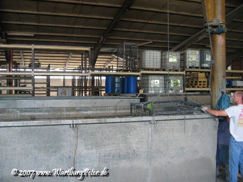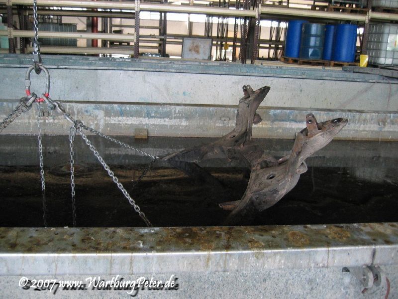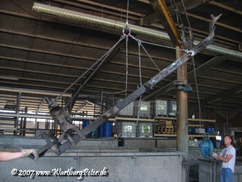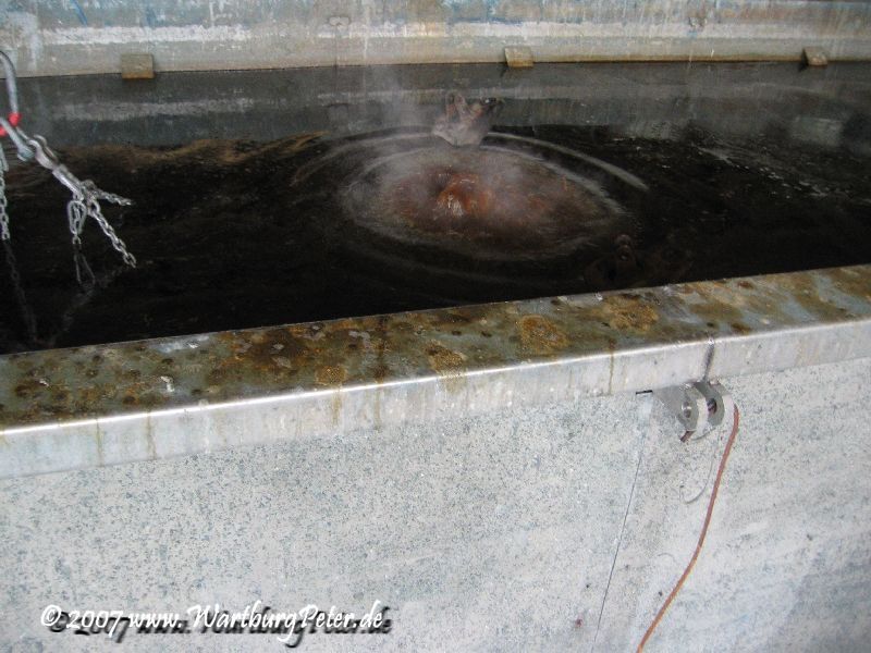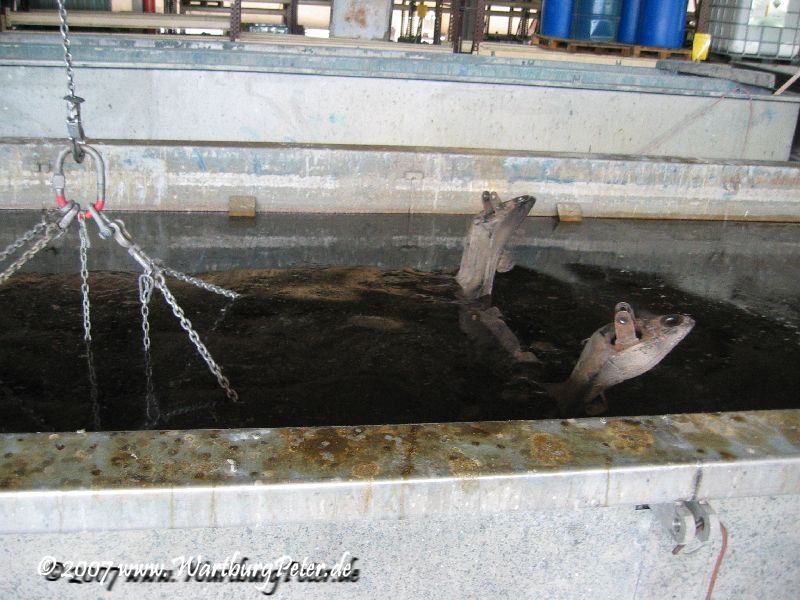 Mit freundlicher Genehmigung durfte ich den Vorgang des Eintauschens in das Reinigungsbad mit dem Fotoapparat festhalten. Gleichzeitig kamen noch meine Frontschürze, die Stoßstangenhalterungen, Federn und noch irgend ein fremdes Motorrad mit ins Tauchbad.