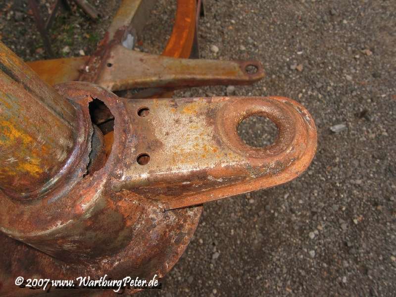 Insbesondere die vorderen Federtöpfe zeigen den Rostschaden nach dem Entlacken deutlich. Hier noch einmal der Zustand vorher - nachher im Vergleich. Beide Seiten sind gleichermaßen betroffen.