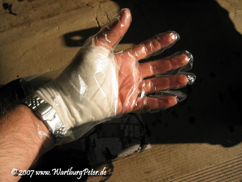 Ein Radmitnehmer vorn ist defekt. Eingelaufen am äußeren Radlager und will er sich nicht trennen lassen. So ein Mist! Zur weiteren Bearbeitung benötige ich jedoch die Bremsscheibe und Radnabe. Also kombiniere ich mein Konterschlaggerät mit den Schwerkraftgesetzen. Wissend, daß man sich dabei verletzen kann, bin ich also besonders achtsam und ziehe obendrein Handschuhe an. Dennoch ist es passiert. Ich bekomme zwar die Teile getrennt, quetsche mir aber erheblich beide Hände, links sogar tief in das nun offene Fleisch. Voller Freude hüpfe ich nun wie Rumpelstielzchen auf der Stelle herum und beglückwünsche mich zu den Handschuhen. Ohne wär's schlimmer.