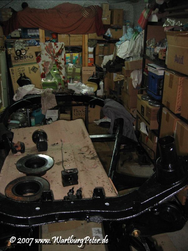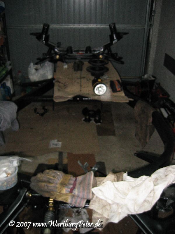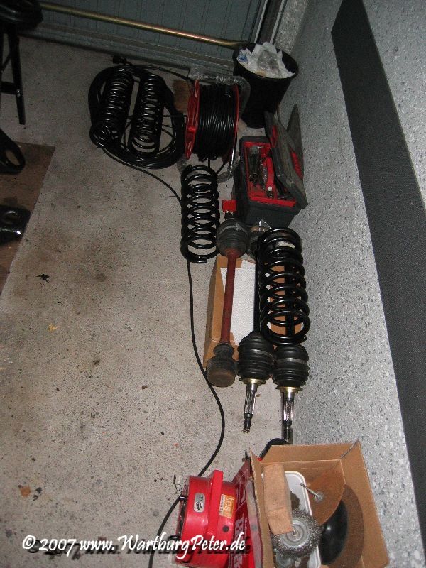 Ich habe zwar keinen Strom in der Garage, aber einen Verbandkasten. Immerhin kann ich noch bis tief in die Nacht arbeiten. Meist fange ich nach der Arbeit so gegen 19 Uhr an und werkele so 3 Stunden täglich am Fahrwerk. Nur am Wochenende, da bin ich ab Mittags zu Gange.