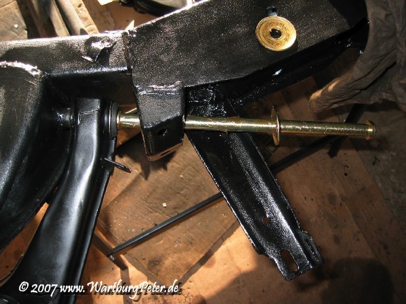 Es empfiehlt sich zur Montage der hinteren Querlenker außen einen Stab hineinzustecken und damit den Querlenker abzustützen. Dann kann man in Ruhe von der Mitte des Rahmens her den Rundstab einfädeln. Dabei sollte man die Druckscheibe direkt neben die Silentbuchse einfädeln, sie paßt nicht durch die Halterung des Stabilisators am Rahmen.