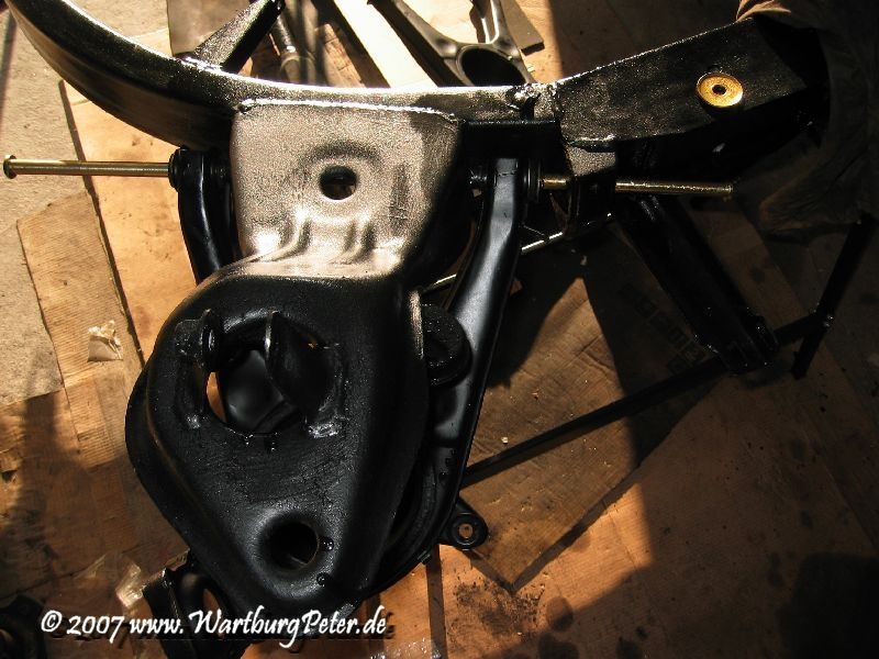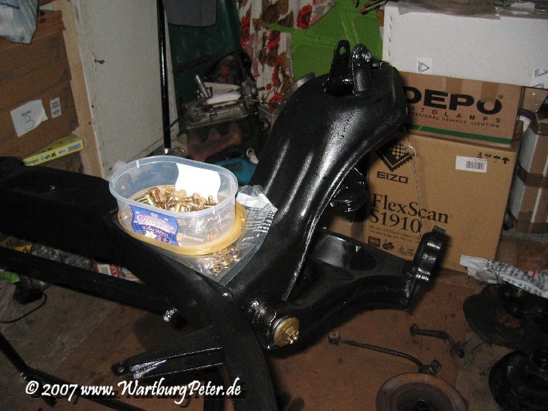 Die Querlenker hinten sitzen etwas straffer, so daß das Einpressen hier deutlich schwerer und fehlerbehafteter ist.