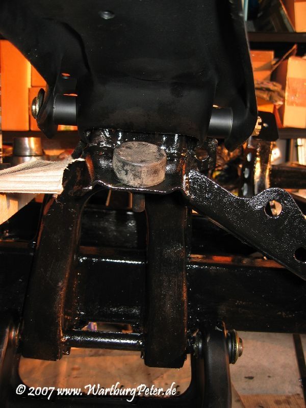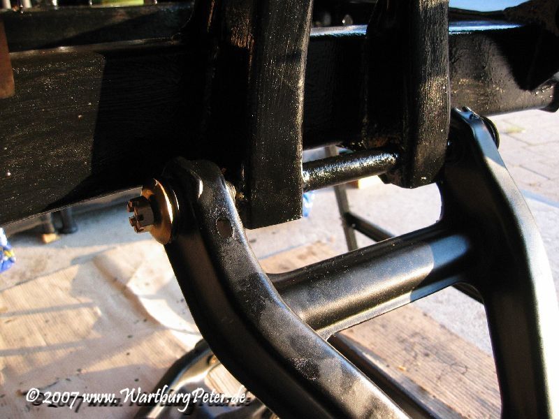 Den Druckscheiben kommt eine besondere Rolle zu. Sie pressen die Metallhülsen in den Silentbuchsen gegen die Hülsen am Rahmen und stellen den erforderlichen Kraftschluß zum Rahmen her. Alles was nachher die Auslenkung der Querlenker ermöglicht, ist allein der Gummi in den Buchsen! Da dreht sich kein Stab, keine Scheibe, keine Hülse!