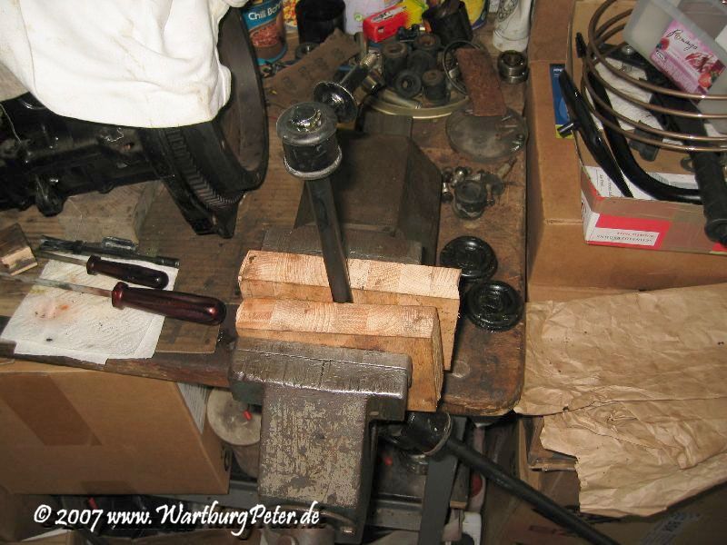 Mit zwei Hartholzklötzern spannt man nun das Stabilisatorgestänge kräftig in den Schraubstock, fettet den "Gleitweg" kräftig ein, z.B. mit Vaseline und Muskelprotze können nun das Gummilager aufdrücken, viel leichter geht das jedoch mit einem kräftigen Bello, also schweren Hammer. Zwei gezielte Schläge und das Gummilager sitzt auf der Stange. Bei der anderen Seite verfährt man ähnlich, wobei man die Richtung der Gummilager, die sind ja unsymmetrisch gefertigt, beachten muß.