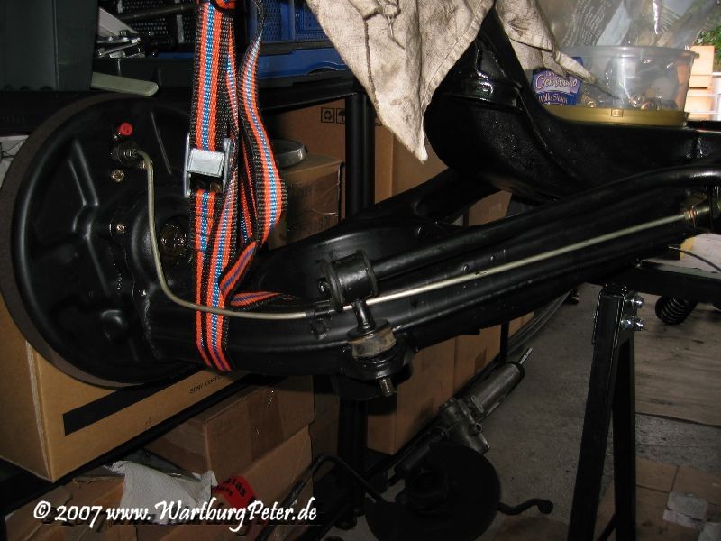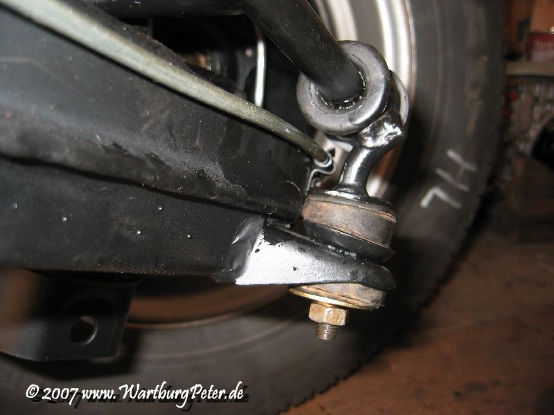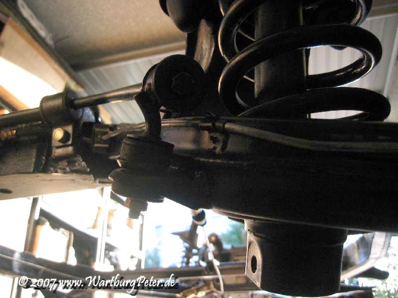 Genau dort verläuft die Bremsleitung, vorgegeben durch die Halterung am Querlenker. Damit verläuft die Bremsleitung gefährlich nahe an der Halterung des Stabilisators. Das ist schlecht.