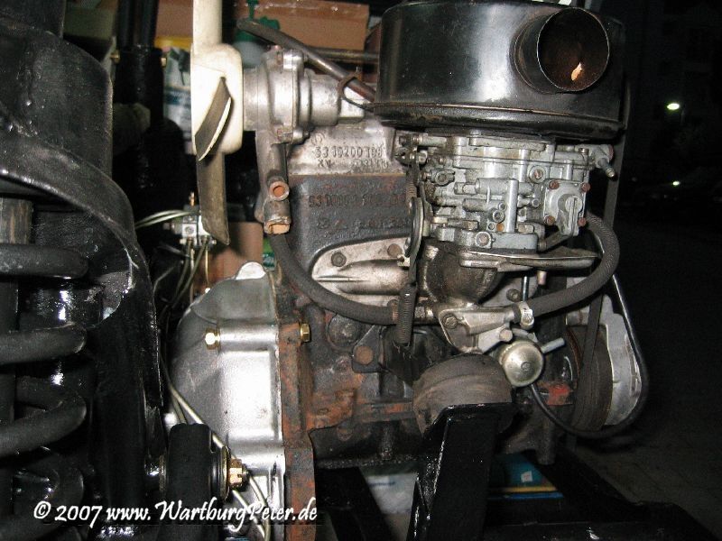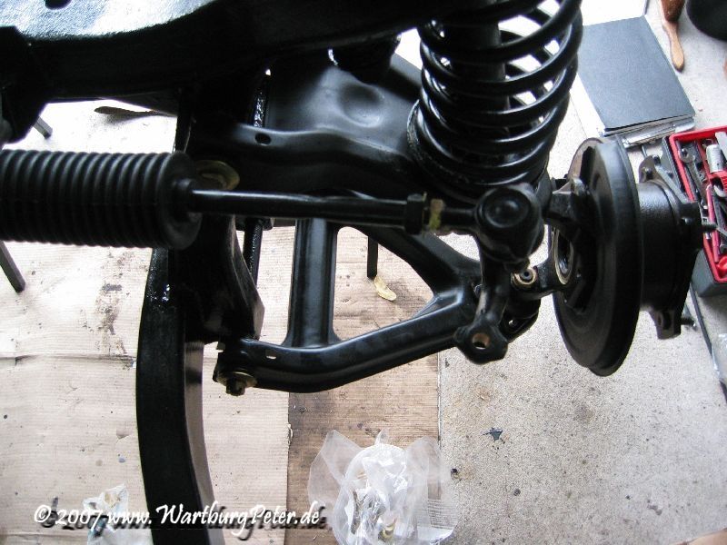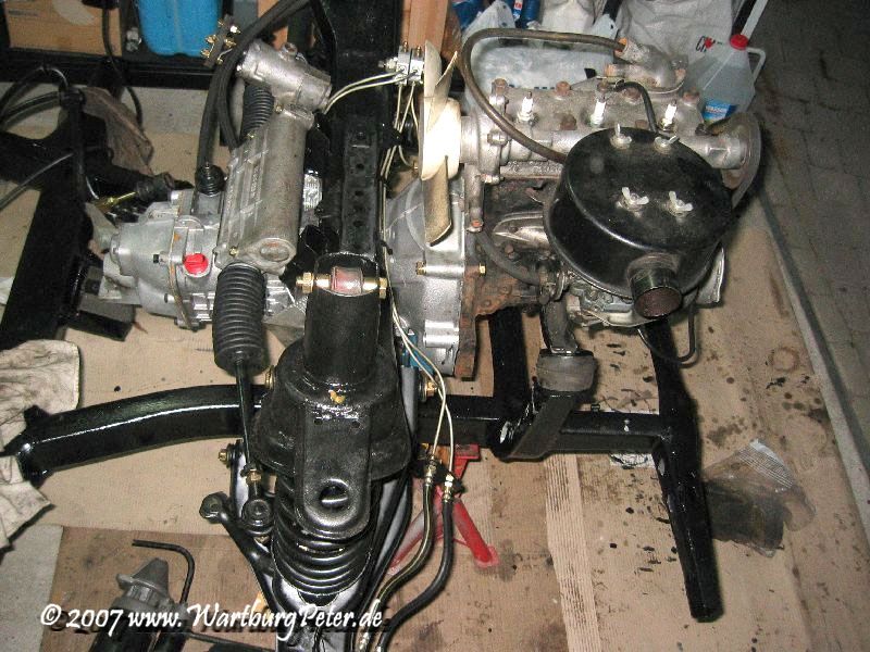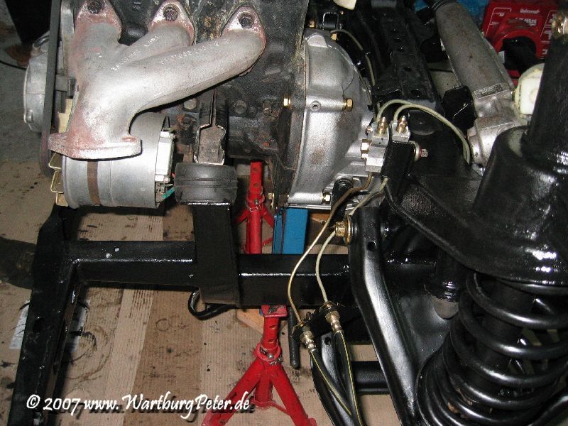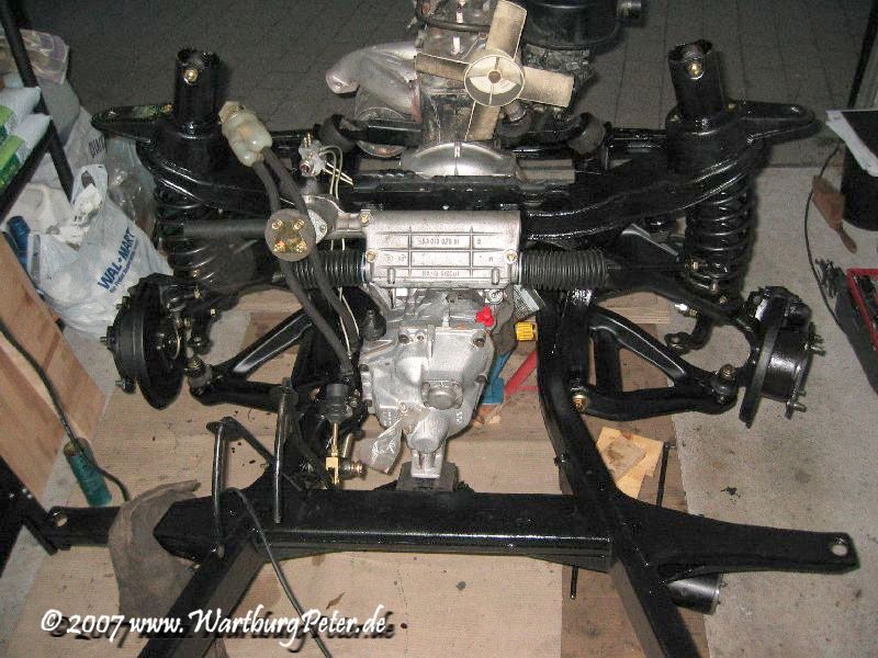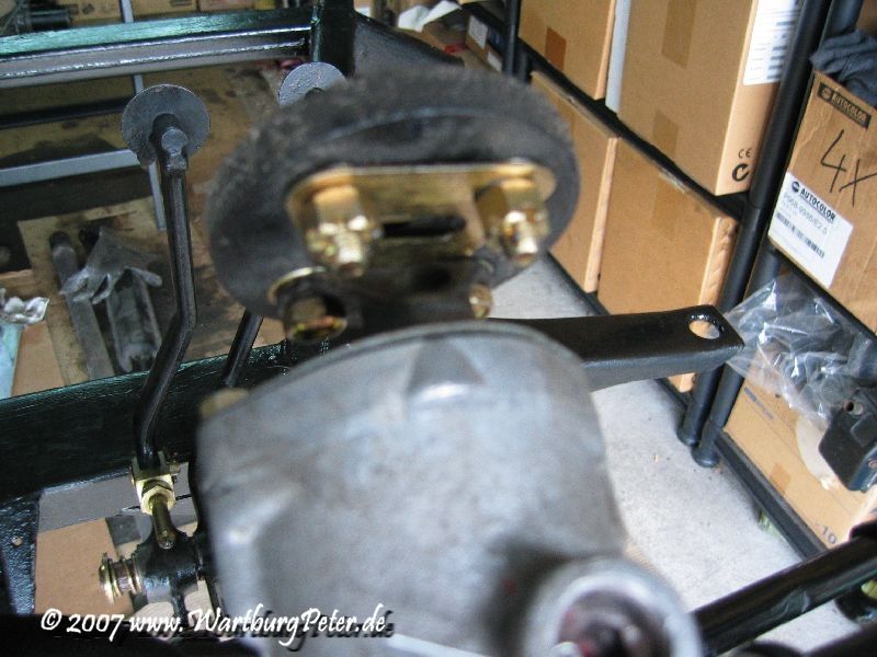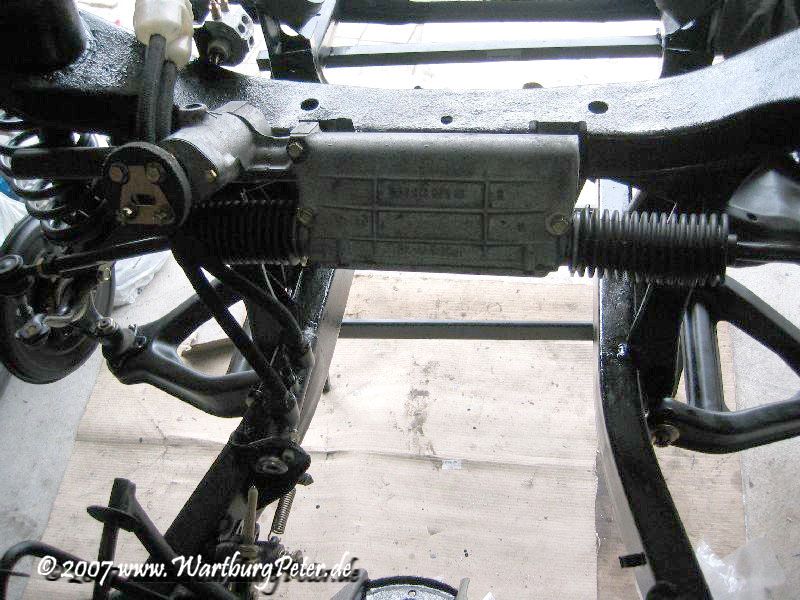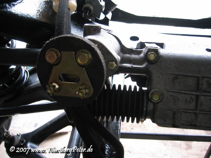 Nur noch wenige verbleibende Arbeiten; das Lenkgetriebe mußte noch angeschraubt werden. Die Lage der Schrauben und Sicherheitsbleche an der Hardyscheibe nach AWE-Vorschrift kann man gut erkennen.