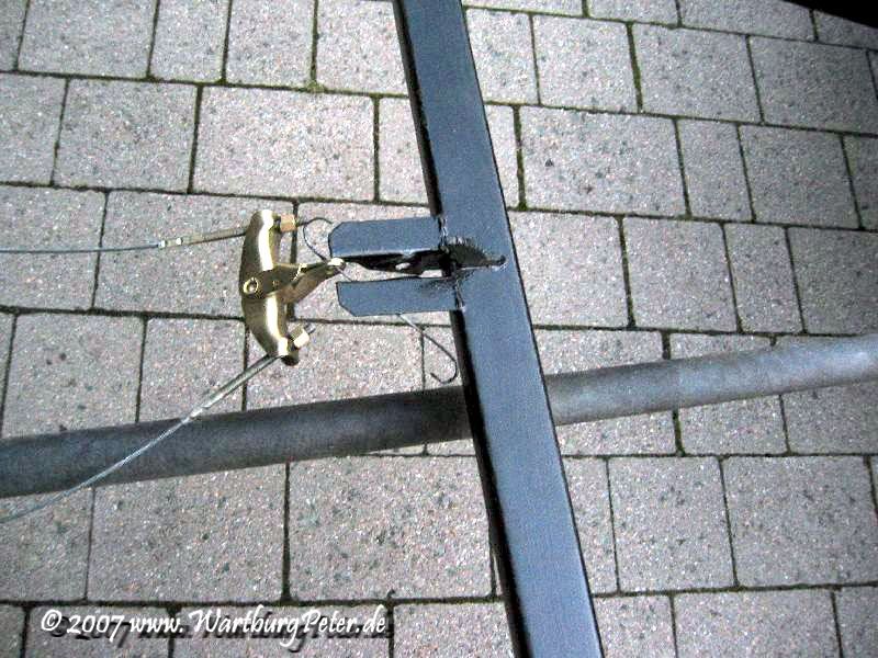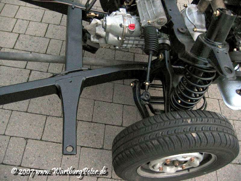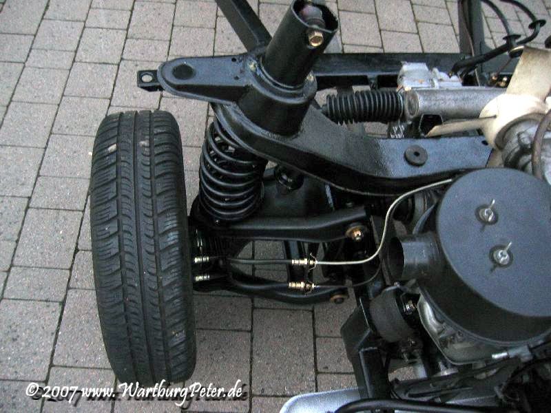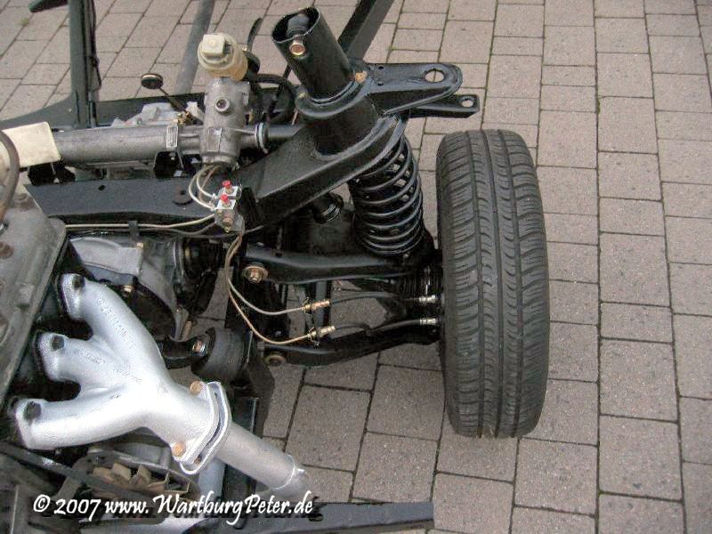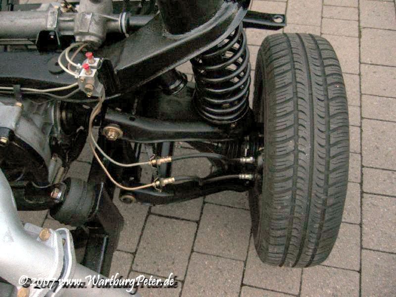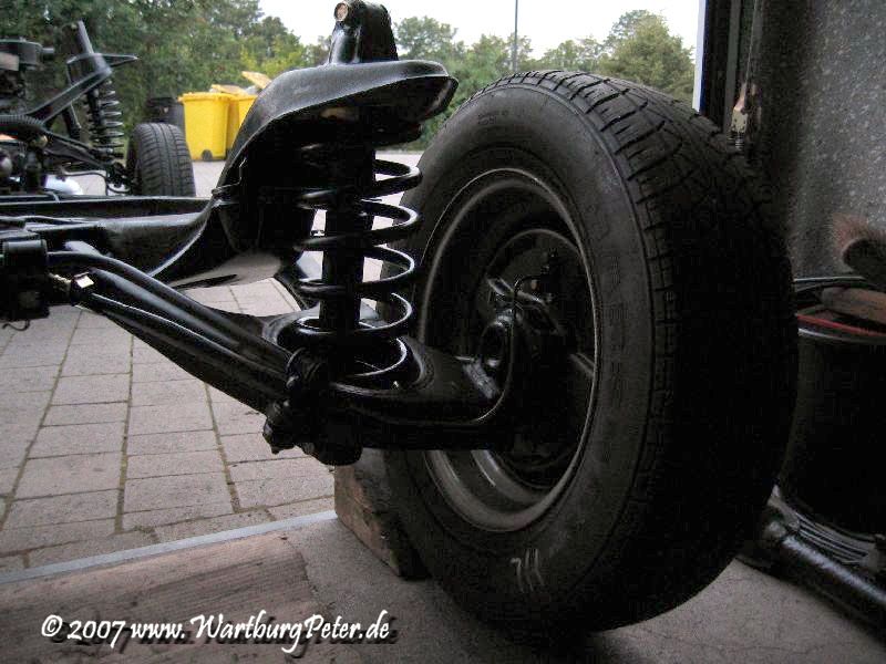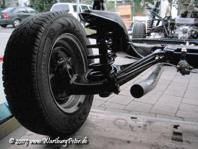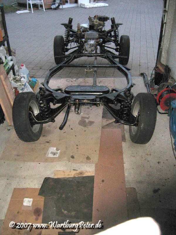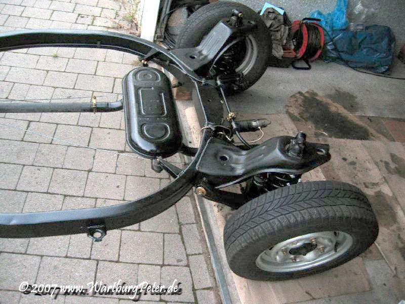 Die Bremse ist entlüftet, Räder montiert, alle Teile dran, nichts blieb übrig! Nun kann das Fahrgestell endlich auf eigenen Rädern stehen. Morgen wird die Karosserie drauf geschraubt. Hurra!