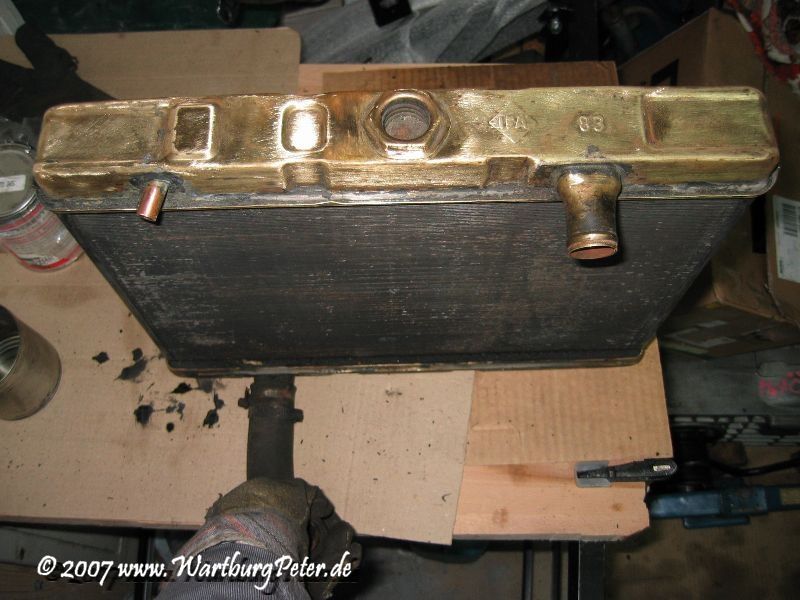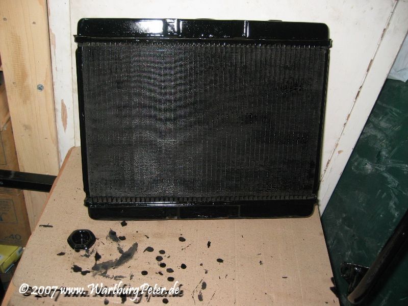 Den Kühler beabsichtige ich ebenfalls mit POR15 zu behandeln. In diesem Falle ist ROstschutz zum Glück Nebensache. Was mir am POR15 gefällt ist die Tatsache, daß dieser Lack Kratz- und Schlagfest ist. Nach gründlicher Reinigung und Entfettung ist das gute Stück schon bald gestrichen und am nächsten Abend eingebaut.