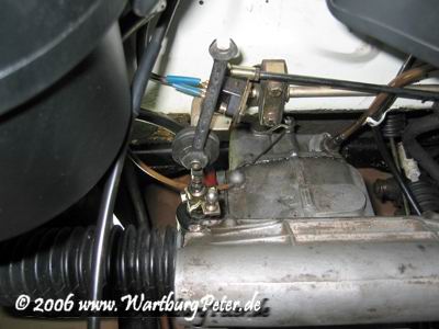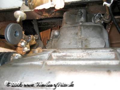 Massekabel, Tachopese, Schaltung, Freilaufzug müssen gelöst werden. Man kommt an alles ganz gut heran, wenn man den Kühler herausgenommen hat. Sofern noch nicht geschehen, ist das Auto aufzubocken, die Vorderräder abzunehmen. |
