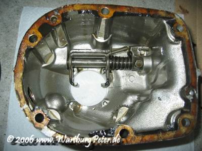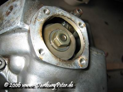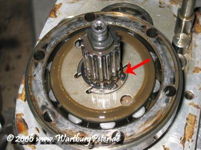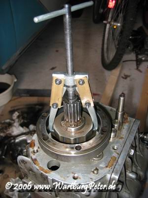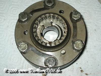Normalerweise käme jetzt ein Spezialabzieher zum Einsatz, um die Tachoscheibe von der Welle zu ziehen. Wartburgfreund Kuli gab mir in dieser Hilflosen Situation Rat und so muß man ein wenig Ruckeln und Zuckeln und das gelöste hintere Gehäuse so zur Seite drücken, daß der Sperrhebel des Freilaufmitnehmers aus der Führung rutscht. |