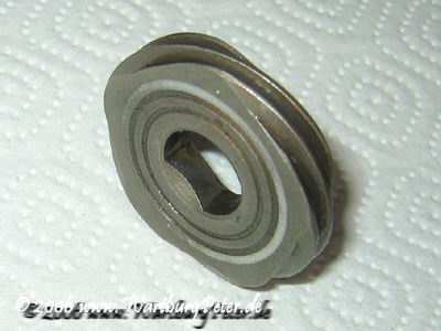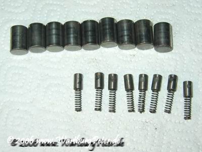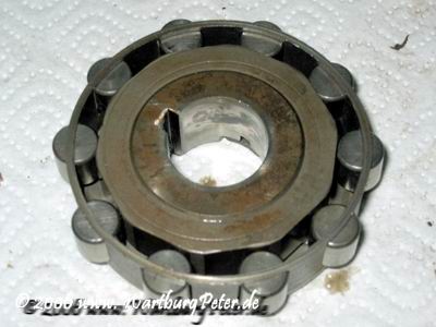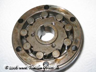 Bei diesem Freilauf handelte es sich um ein Gebrauchtteil. Man kann schon etwas Verschleiß an den Federbuchsen und Rollen erkennen. Jedoch sind diese Laufmarken nicht weiter tragisch. Bauart bedingt, funktioniert der Freilauf in jedem Fall, solange die Federn in Ordnung sind. Die 9 Federn sollten gleich lang sein. Ein übertriebenes Dehnen sollte man vermeiden, sonst reiben die Rollen unnötig im Freilauf. |