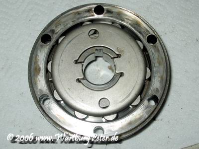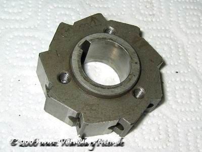 Man löst den Tachoantrieb (2 Schrauben) und zieht diesen heraus. Nach Abnehmen des Tachodeckels, ist die Tachoscheibe zu lösen. Damit sich nicht alles mitdreht, kann man durch die Ölablaßschraube die Freilaufglocke festhalten.