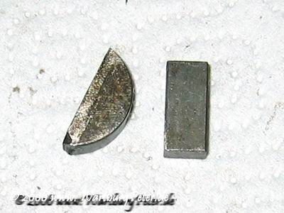 Die linke Feder (Keil) nimmt den Freilaufnocken auf der inneren Welle (vom Motor kommend) mit, die rechte Feder die Freilaufglocke auf der äußeren Welle (getriebeseitig). Beide Wellen sind ineinander gesetzt wie Minuten- und Stundenzeiger einer Uhr. |