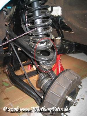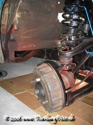 Die Bremstrommeln sind zu sichern. Die Bremsschläuche dürfen nicht belastet werden. Um mir die weitere Arbeit zu erleichtern, habe ich die Antriebswellen mit Gummiseilen nach oben gebunden. Nun wären noch die Antriebsmanschetten zu lösen und natürlich die Getriebeaufhängung hinten. |