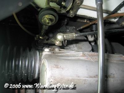 Es gibt unterschiedliche Kugelgelenke. Oft findet man an der 311/ 312'er Schaltung solche, die zur Sicherung gegen unabsichtliches Auseinanderfallen eine kleine Spange verwenden. Diese ist nach unten zu ziehen, danach läßt sie sich in Richtung des Gewindezapfens herausziehen. Gut aufbewahren. Die kleine Spange muß später in die dafür vorgesehene Bohrung in den Kugelkopf eingesetzt werden. |