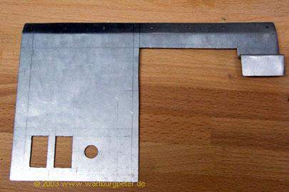 Dieses Blech wird 2 Schalter, sowie den Shoke-Bowdenzug aufnehmen. Außerdem soll daran die Mittelkonsole befestigt werden. |