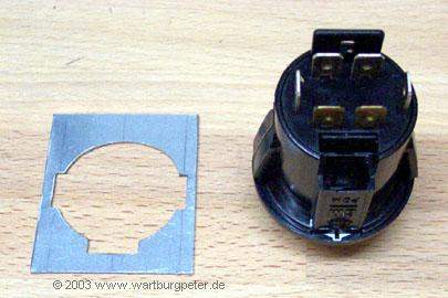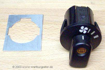 Da der Lüfter, den ich für den Wartburg vorgesehen habe über 3 Leistungsstufen verfügt der Originalschalter jedoch nur 2 kennt und obendrein mit der Zeit schon einmal zu Wackelkontakten neigt, habe ich mich entschlossen, einen "betriebsfremden" Schalter zu verwenden. Hier sieht man den Schalter vom Opel Kadett. Vorteilhaft: Der Schalter ist beleuchtet, beinhaltet gleich den Kontakt für die heizbare Heckscheibe und kann über einen Kontaktblock (nicht im Bild) auf einmal abgekabelt werden. |