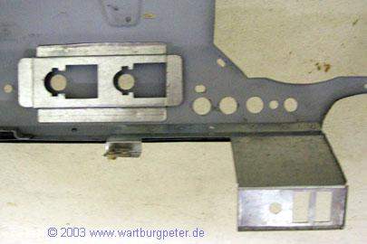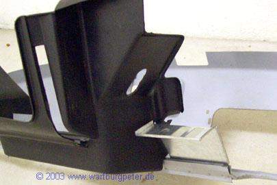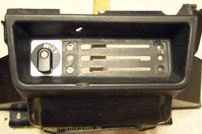 Flugs habe ich aus einem Stück Blech eine neue Blende angefertigt, die ich über die rechteckige Öffnung gesetzt habe. Diese Blende ist mit 4 winzigen Schrauben am Mittelteil des Armaturenbrettes befestigt. Ich denke, die folgenden Bilder bedürfen keiner Erklärung. |