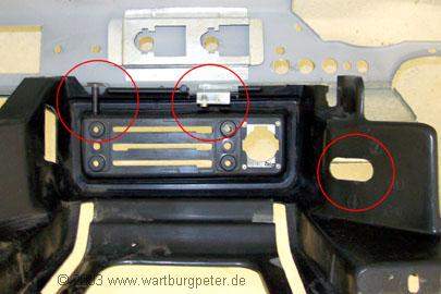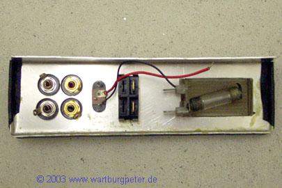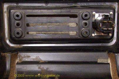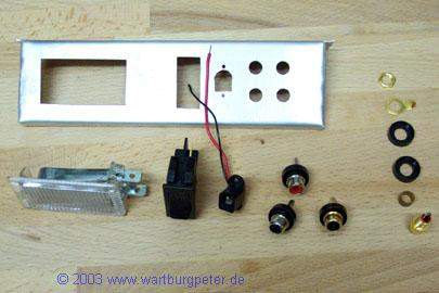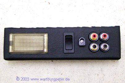 Eine kleine Bastelei: Die Innenbeleuchtung im Wartburg ist miserabel. Also fertigte ich eine Beleuchtung für die rechte Ablage an. Des weiteren haben moderne Radios div. Ein- und Ausgänge. Eine Buchse für die Stromversorgung externer Geräte kommt noch dazu. Wichtig ist, alles muß von Masse isoliert sein, sonst gibt es merkwürdige Effekte im Radio! Die Leuchte stammt übrigens von einem Opel. |