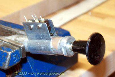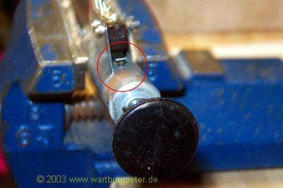 Eine weitere kleine Spielerei am Rande: Ich wollte schon immer eine optische Anzeige haben, ob der Shoke geöffnet ist oder nicht. Also eine Schelle gebastelt, einen Mikrotaster befestigt, an passender Stelle ein Loch in die Bowdenzughalterung gebohrt und einen Stahlniet mit rundem Kopf von innen her eingesetzt. Die Zugstange wird etwas befeilt, der Taster justiert und fertig ist der Sensor für den Shoke. |