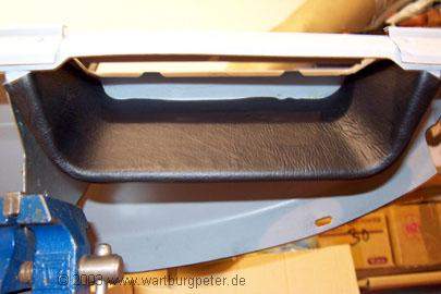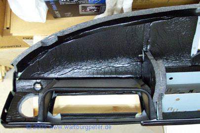 Den Vorgang des Zurechtschneidens und Beklebens mit Kunstleder habe ich nicht fotografiert. Ich wollte mit klebrigen Fingern den Fotoapparat nicht halten. Man schneidet nach der Form der alten Lederreste neue Stücke aus. Ich war spendabel und habe so großzügig ausgeschnitten, daß das Kunstleder fast kein Stück Armaturenbrett frei läßt, so auch der Rand, der an der Stirnwand festgeschraubt wird. Dies dämpft zugleich Quietschgeräusche und die Weiterleitung von Schwingungen. Das Kunstleder muß immerhin so großzügig bemessen sein, das es um alle Kanten herum geklebt werden kann. Öffnungen, wie die des Radios, werden so eingeschnitten, das man das Kunstleder von der Mitte der geplanten Öffnung diagonal zu den Eckpunkten einschneidet. Gerade die Ränder sind sehr sorgfältig zu kleben, damit sich das Kunstleder dort nicht ablöst. Man kann dann entscheiden, ob man mit das Kunstleder um die Kante herum klebt oder ob man das Leder bündig mit der Kante mit einem scharfen Messer abtrennt. Je nach Verwendung des Klebers, sind die Verarbeitungsvorschriften desselben zu beachten. Wegen der extremen Temperaturbereiche im Auto, sollte man einen Klebstoff verwenden, der explizit für diese Temperaturen geeignet ist. |