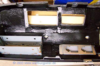 Natürlich werde ich das Blech mattschwarz lackieren. Hier auf diesen Bildern noch nicht zu sehen: auch diese Mittelkonsole habe ich von hinten vollständig mit Dämmstoff beklebt. |