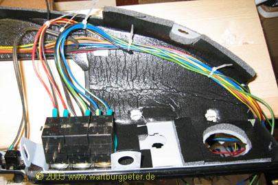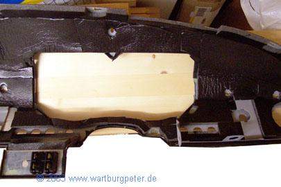 Das gesamte Armaturenbrett ist bis in die kleinste Ritze mit der gleichen Schaumstoffmatte beklebt, die ich auch für die Motorhaube verwendet habe. Für Schrauben und Schalter läßt man die entsprechenden Stellen frei. |
