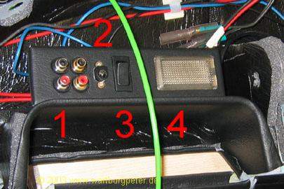 1 - Line-in/ Line-out Anschlüsse 2 - Anschluß für Stromversorgung externer Geräte 3 - Lichtschalter für die Beleuchtung der Ablage 4 - Licht für die Ablage Die Konstruktion ist mit Klettband befestigt, so kann man sie zu jeder Zeit abnehmen. |