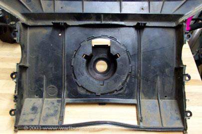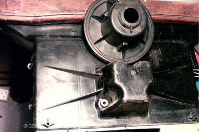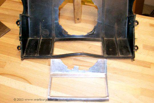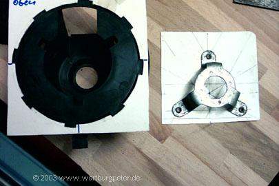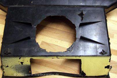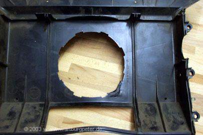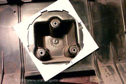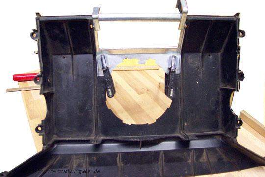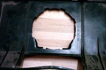 Zunächst heißt es wieder Maß nehmen, vergleichen, Einbaulage ermitteln. Am besten per Schablone! Ich habe mich entschlossen, das Gehäuse so umzubauen, daß man den Golflüfter wie im Golf mit einer kleinen Handbewegung ein- und ausschrauben kann. Dazu muß ich eine Öffnung mit etlichen Haltenasen aus dem Verteilergehäuse herausarbeiten. |