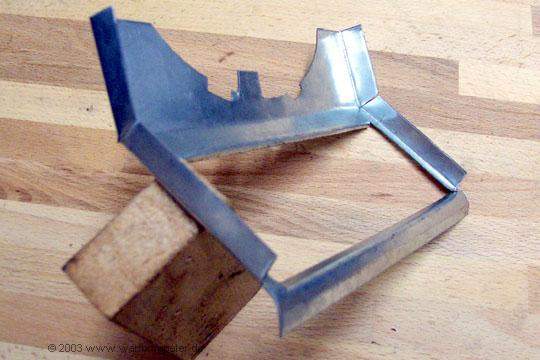 Links im Bild sieht man das Teil, das ich aus verzinktem Tafelblech ausgeschnitten und gefalzt und gebogen habe. |