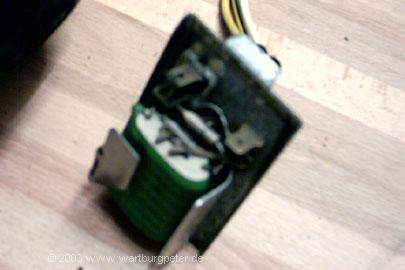 Der Vorwiderstand des VW-Lüfters ist deutlich kompakter und sitzt unterhalb der Anschlußtafel direkt am Motor. Das besondere, er erlaubt drei verschiedene Geschwindigkeitsstufen! |
